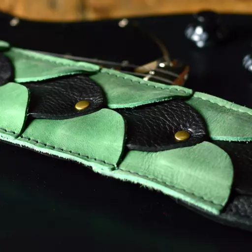 A guitar strap for those who know how to put on a show.   Hand-built from thick leather cowhide* in our own workshop in rural Shropshire, England.  The design was inspired by legends of Welsh dragons just over the border to our west. The top pieces are individually cut out and connected to provide a texture as found on lizard skin, with free edges that move with the wearer.