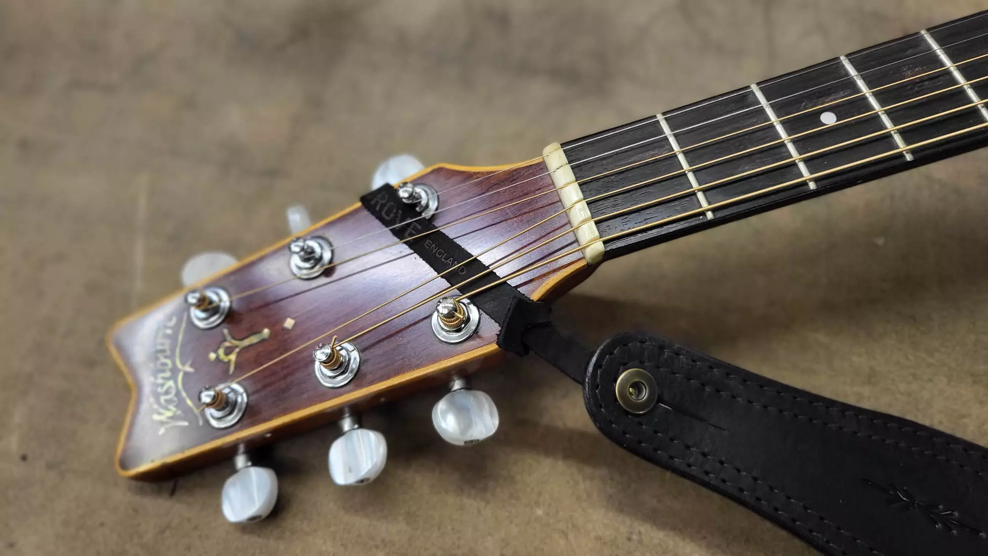 So, if you want to attach the strap to the headstock, you can either just tie it on using some kind of lace or cord, or use a special little device called a headstock loop: