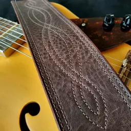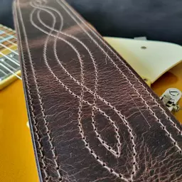 Once the shape has been cut out, the edges go through a 5-stage hand-crafted process of bevelling (rounding), polishing, dyeing, sealing and further polishing. The strap is then double stitched all round for extra strength. This is a professional level guitar strap that feels good, looks good and even smells good.